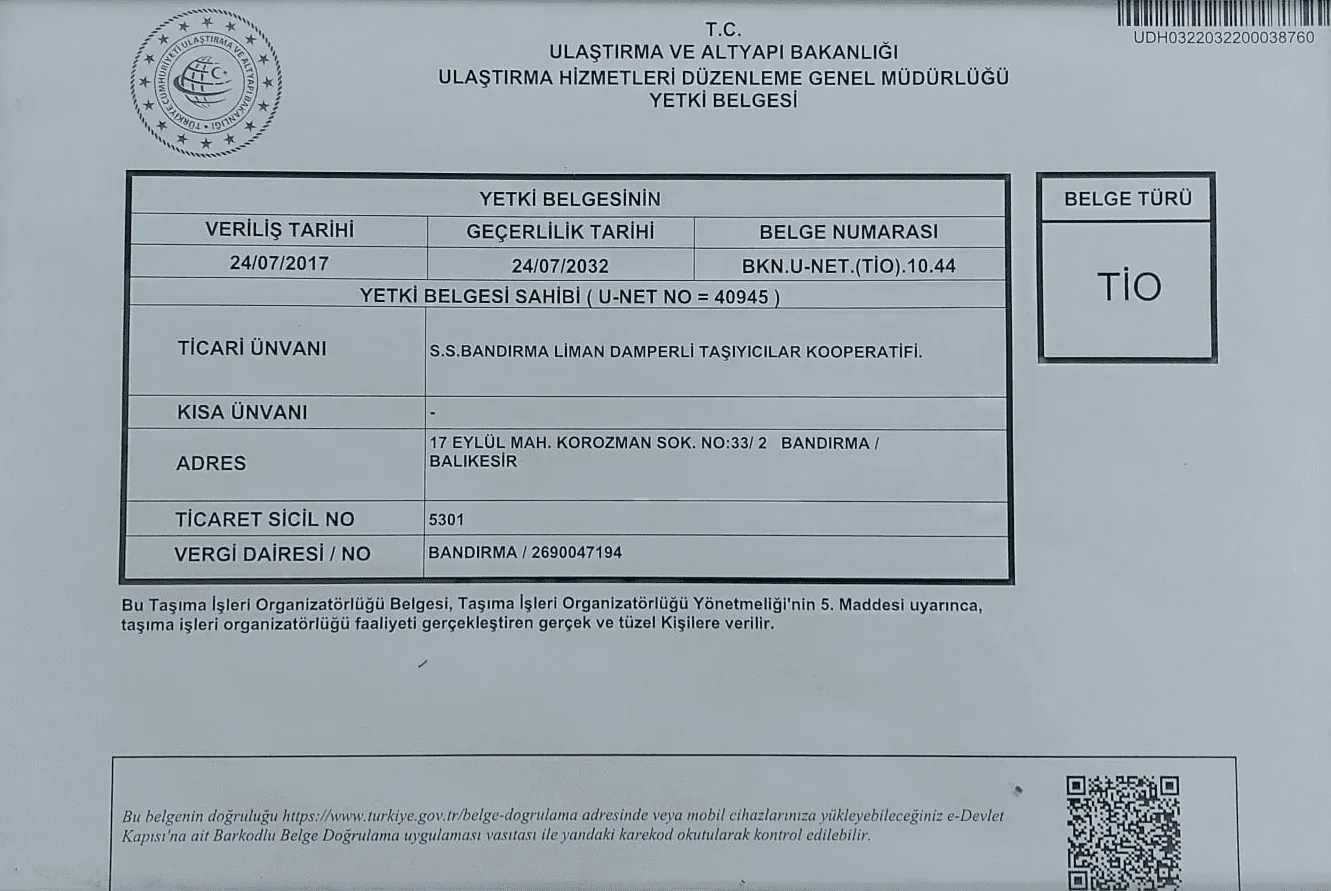 Tio Belgesi | S.S. Bandırma Liman Damperli Karayolu Yük Taşıma Kooperatifi